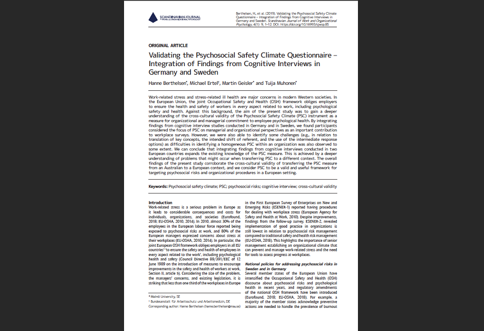 En ny artikel har publicerats om arbetsmiljöverktyget PSC. PSC står för psykosocialt säkerhetsklimat (Psychosocial Safety Climate – PSC) och kan definieras som medarbetarnas delade uppfattningar om organisationens riktlinjer, praxis och procedurer för att skydda deras psykosociala hälsa och säkerhet.