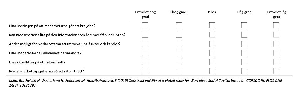 Socialt kapital inom COPSOQ III kan mätas med följande ingress "Frågorna nedan avser inte ditt eget jobb utan din arbetsplats som helhet" samt frågorna nedan: