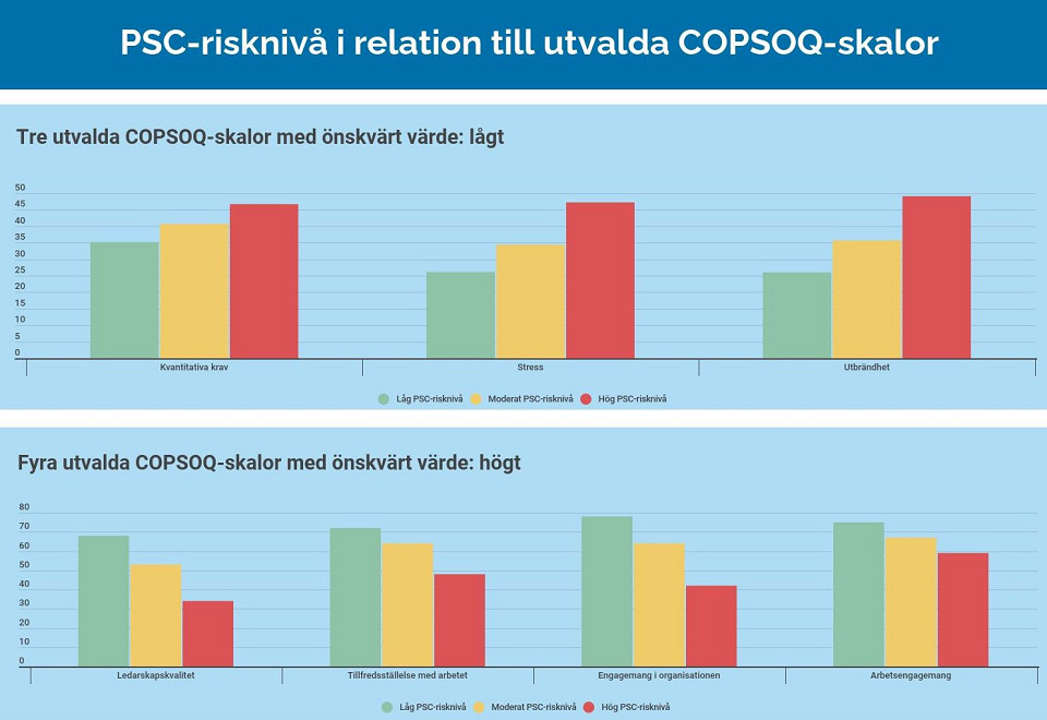 I valideringen av PSC-4 för en svensk kontext, undersökte vi hur genomsnittet för utvalda COPSOQ-skalor var i förhållande till PSC-risknivåer. Illustrationen nedan visar hur de förhåller sig till varandra utifrån två olika exempel: skalor med önskvärt lågt respektive högt värde. Detta är en visualisering av tabell 4 i artikeln.